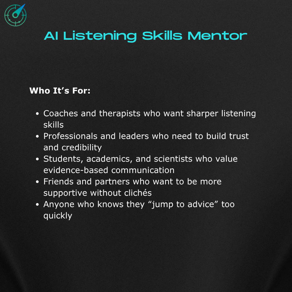 AI Listening Skills Mentor shows you exactly where you fall short and how to improve. Using transcripts, role-play, or summaries, it gives structured, blunt, evidence-based feedback so you can stop giving empty reassurance and start listening like a pro.