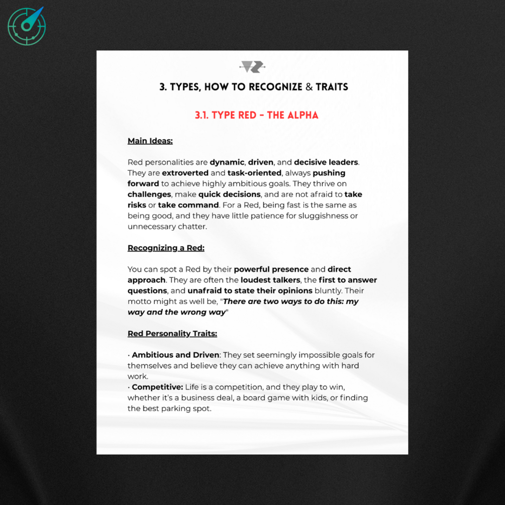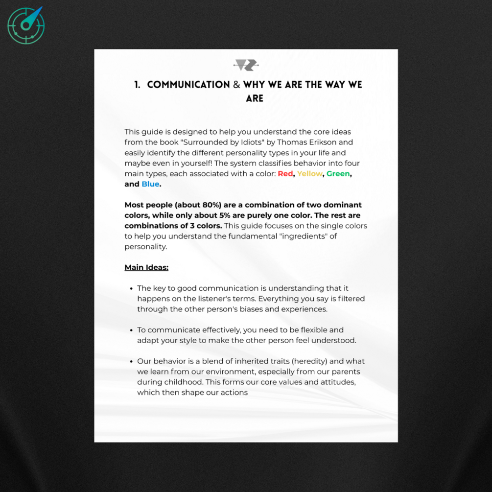 This guide takes the powerful framework from "Surrounded by Idiots" by Thomas Erikson. Makes it simple, practical, and easy to apply. You’ll finally understand the 4 core personality types (Red, Yellow, Green, Blue) and how to spot them, work with them, and communicate without friction.