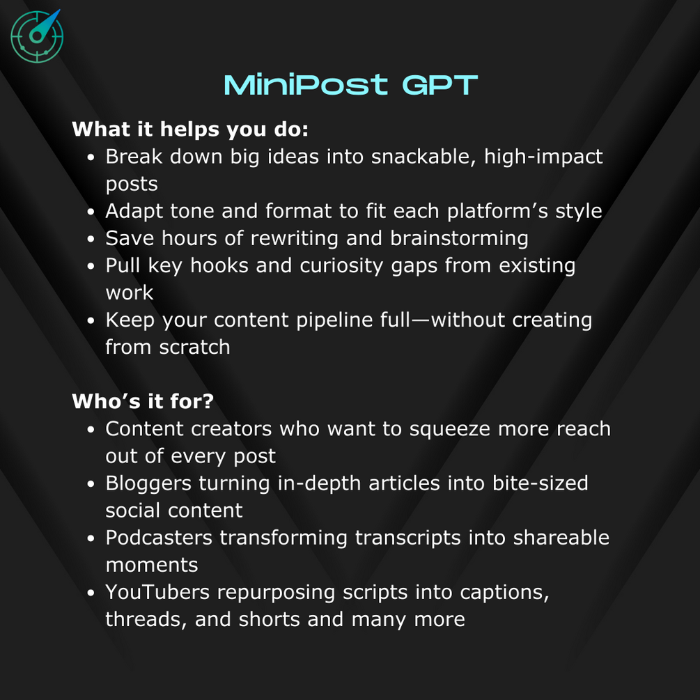 MiniPost GPT - Custom GPT - AI Content Repurposing Strategist - One time payment, unlimited usage