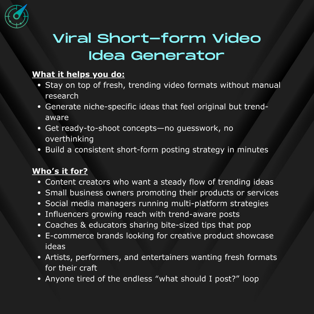 It delivers 15 fresh, trend-aware video ideas tailored to your niche—complete with titles, hooks, and formats—so you can go from idea → shoot → publish in minutes.